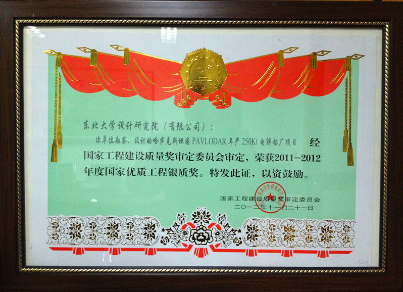 我院设计的哈萨克斯坦PAVLODAR年产250Kt电解铝项目荣获2011-2012年度国家优质工程银质奖,这是境外工程在国内所能获得的最高荣誉